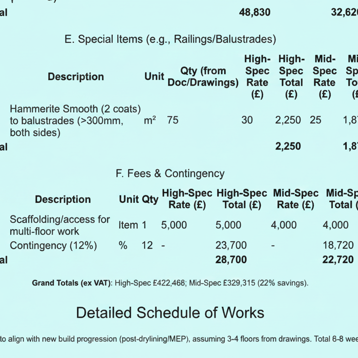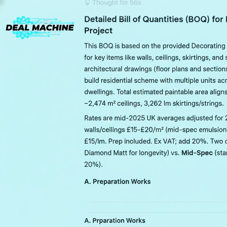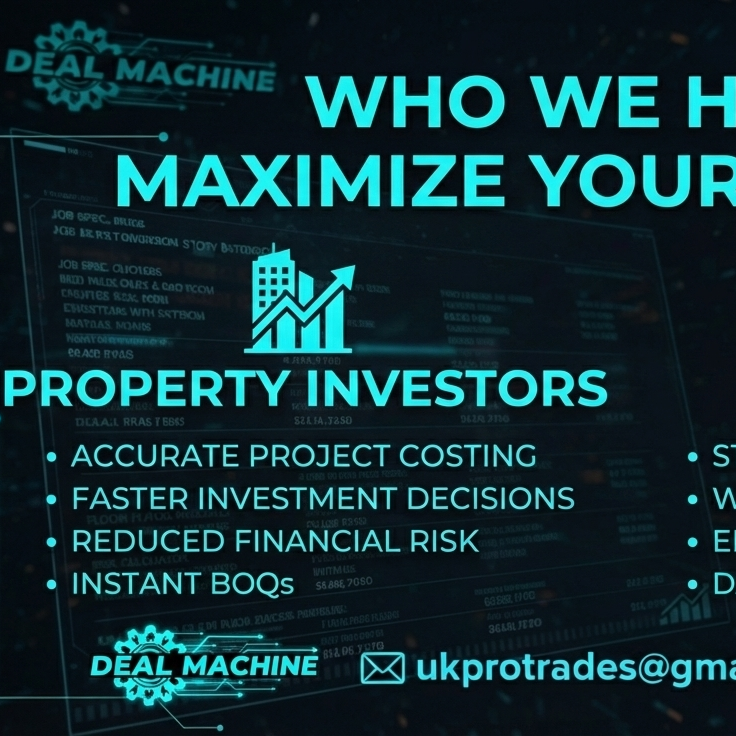 Get started£99 – £199 (based on project size: small refurb £99 | medium HMO/flip £149 | large development £199) Includes full BOQ, breakdowns, analysis, ROI optimisation, vetted contractor intros, and materials at/below trade.